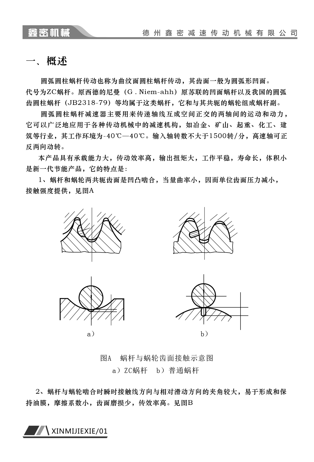 齒型傳動(dòng)類型:蝸桿齒型加工包含ZC1,ZI,ZA、ZN、ZK,蝸桿頭數(shù)1-6頭, 蝸輪和蝸桿兩共軛齒面是凹凸嚙合,當(dāng)量曲率小,因而單位齒面壓力減小,接觸強(qiáng)度提高.蝸輪蝸桿機(jī)構(gòu)常用來(lái)傳遞兩交錯(cuò)軸之間的運(yùn)動(dòng)和動(dòng)力。