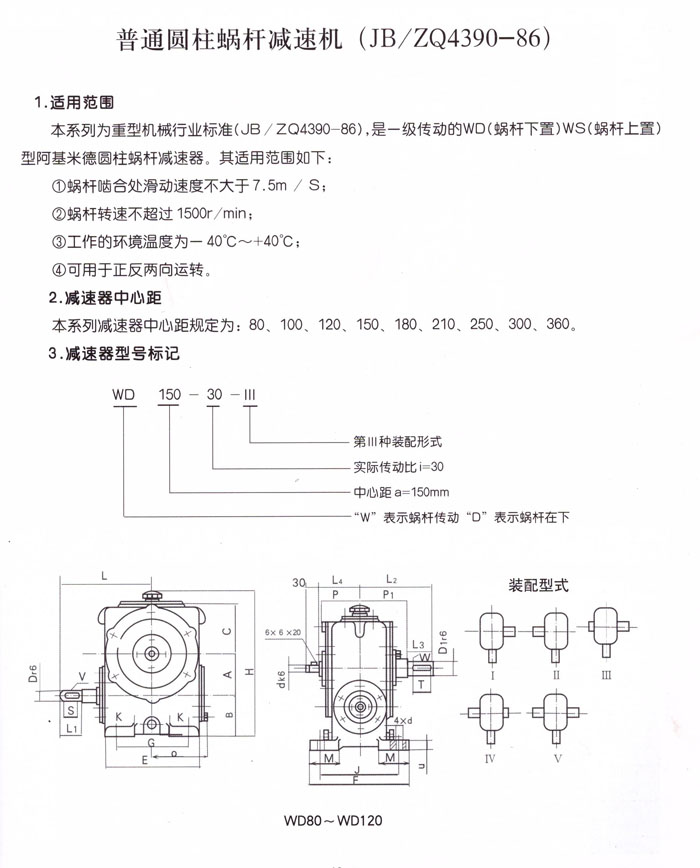 WD圓柱蝸桿減速器標(biāo)準(zhǔn)為一級(jí)傳動(dòng)的阿基米德圓柱蝸桿減速器;WS(蝸桿上置)WD(蝸桿下置)。(蝸阿基米德圓柱蝸桿減速器適用于蝸桿嚙合處滑動(dòng)速度不大于7.5m/s;蝸桿速度不超過1500r/min;工作環(huán)境溫度為-40~+40℃;并可正、反方向運(yùn)轉(zhuǎn)的場合。