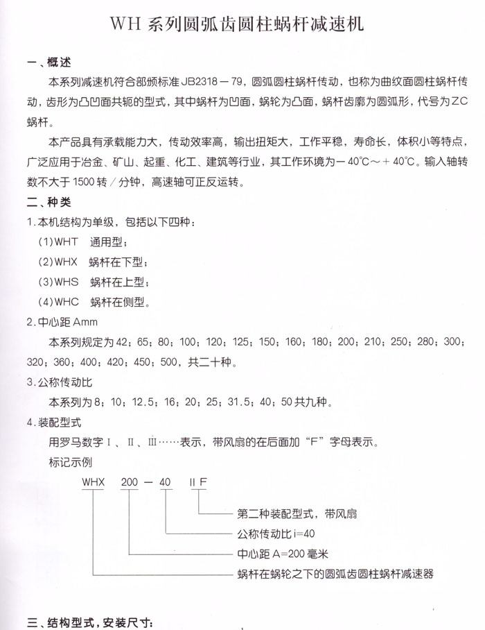WHC型圓弧齒圓柱蝸輪蝸桿減速機符合國家頒布標準(JB2318-79)包括WHT、通用型,HWX蝸桿在蝸輪之下、WHS蝸桿在蝸輪之上和WHC蝸桿在蝸輪之側(cè)四個系列。減速機的蝸輪與蝸桿嚙合部是凸凹嚙合,在嚙合區(qū)的絕大部分綜合曲率半徑大,提高了承載能力,同時該齒形合理地減薄了蝸桿齒厚。