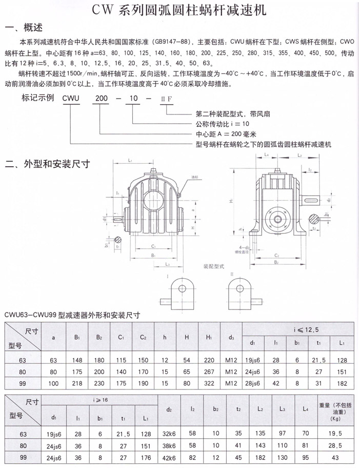 CWS系列圓弧圓柱蝸桿減速器是按照國家標(biāo)準(zhǔn)國號GB9147-88生產(chǎn),蝸桿傳動也稱為曲紋面圓柱蝸桿傳動,其齒面一般為圓弧齒凹面,代號為ZC蝸桿。原西德的尼曼(G.Niem-ahh)原蘇聯(lián)的凹面蝸桿以及我國的圓弧齒圓柱蝸桿(JB2318-79)等均屬于這類蝸桿,它和與其共軛的蝸輪組成蝸桿副,圓弧齒圓柱蝸桿主要用來傳遞軸線互成空間正交的兩軸間的運(yùn)動和動力,它可以廣泛的應(yīng)用于各種傳動機(jī)械中的減速機(jī)構(gòu),如冶金、礦山、起重、化工、建筑等行業(yè),主要包括CWS,CWU,CWO三種安裝形式。